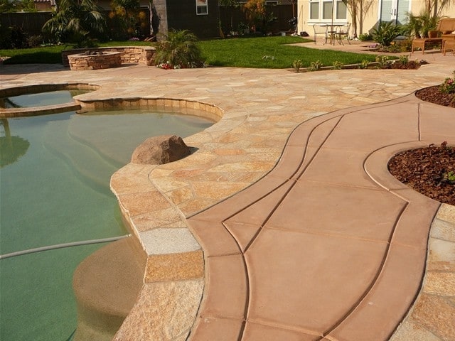 This Patio Was Integrally Colored With Davis Colors Mesa Buff The Concrete Was Stamped With Colored Concrete Patio Concrete Patio Designs Concrete Stain Patio