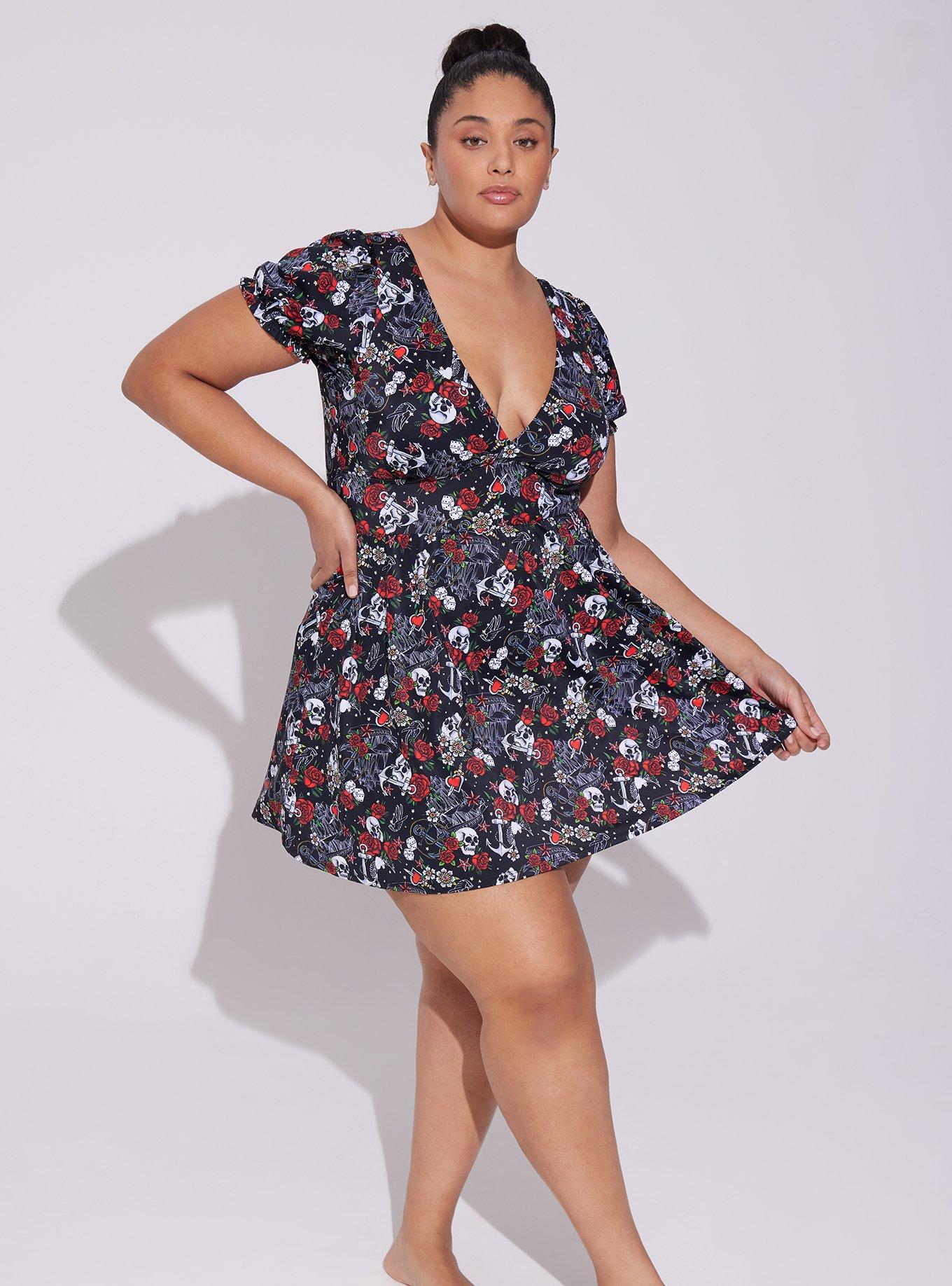 Plus Size Retro Swim Wireless Puff Sleeve Dress Long Length Torrid